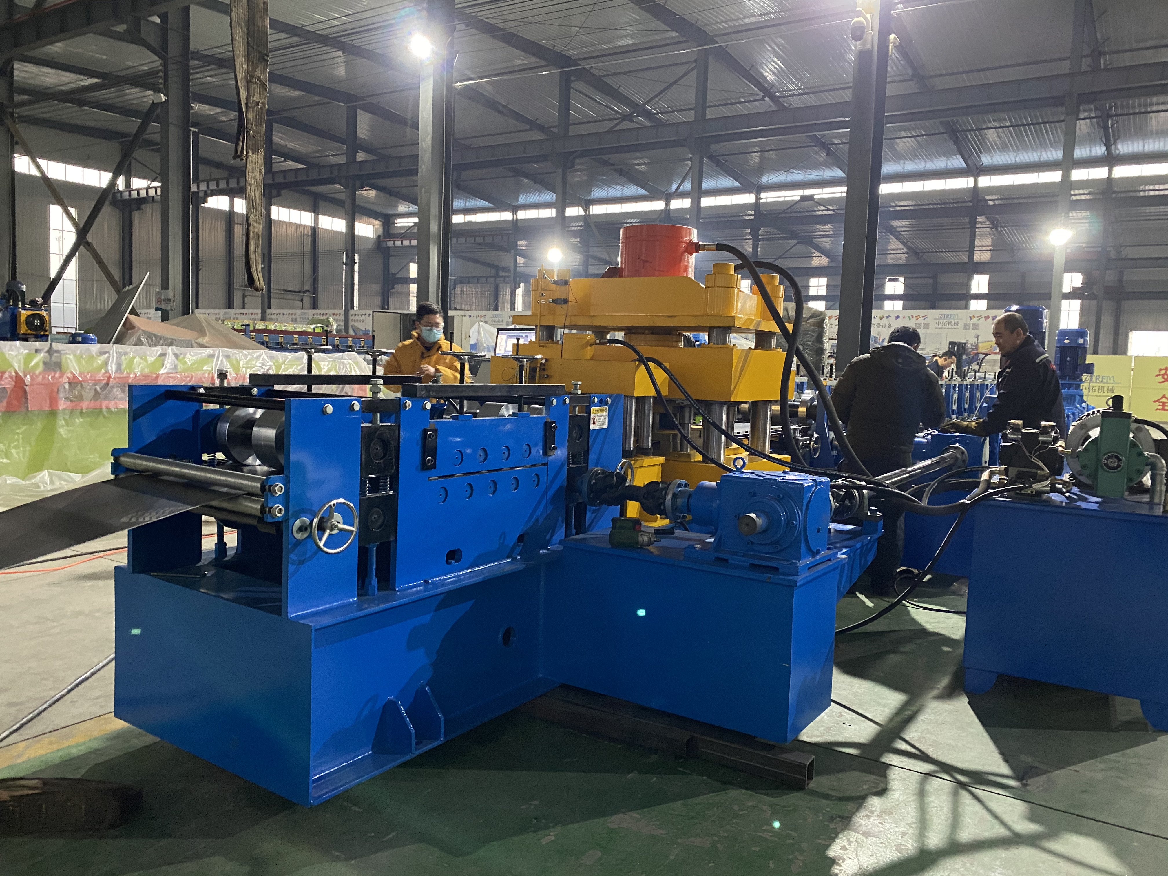 The whole production line is stable when working, we designed the machine with pre- cutting, the material will be cut off before roll forming, and together with punching holes.
